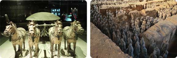 Upon ascending the throne at the age of 13 (in 246 BC), Qin Shi Huang, later the first Emperor of all China, had begun to work for his mausoleum. It took 11 years to finish. It is speculated that many buried treasures and sacrificial objects had accompanied the emperor in his after life. A group of peasants uncovered some pottery while digging for a well nearby the royal tomb in 1974. It caught the attention of archeologists immediately. They came to Xian in droves to study and to extend the digs. They had established beyond doubt that these artifacts were associated with the Qin Dynasty (211-206 BC).